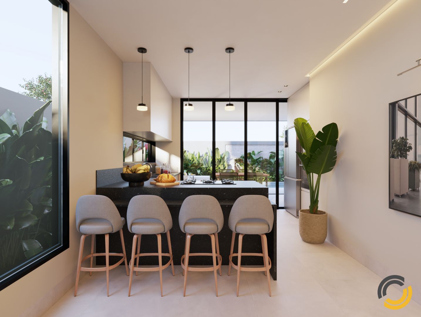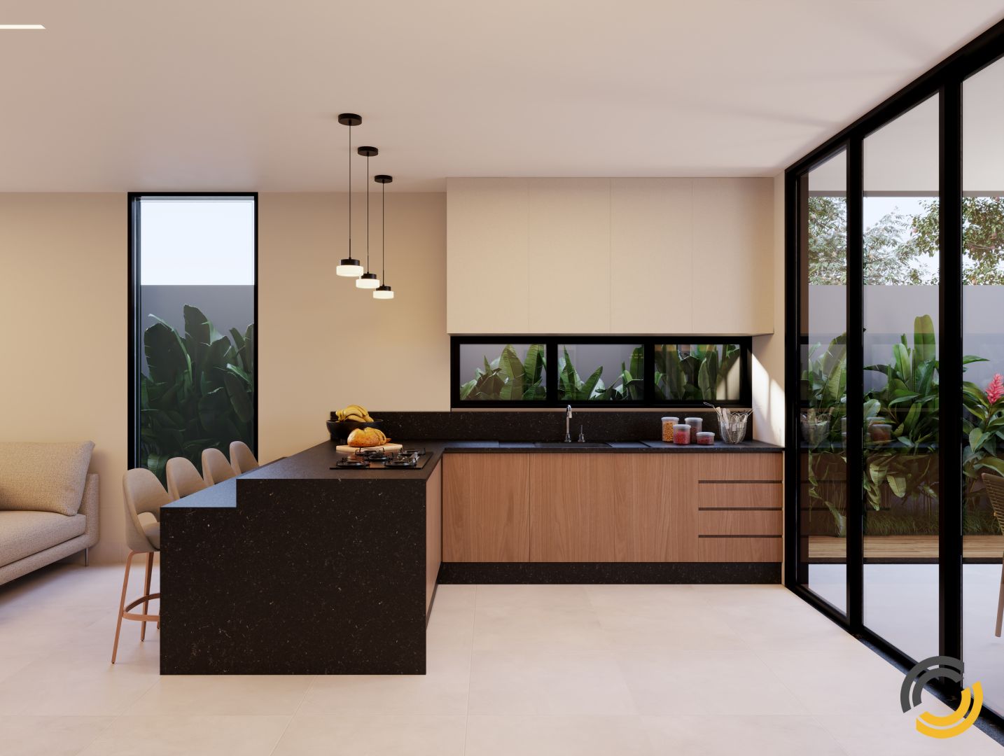 125 m² construídos em um terreno de 250 m². / 3 quartos (sendo 1 suíte). / garagem para até 4 carros (2 cobertos). / sala e cozinha integradas.